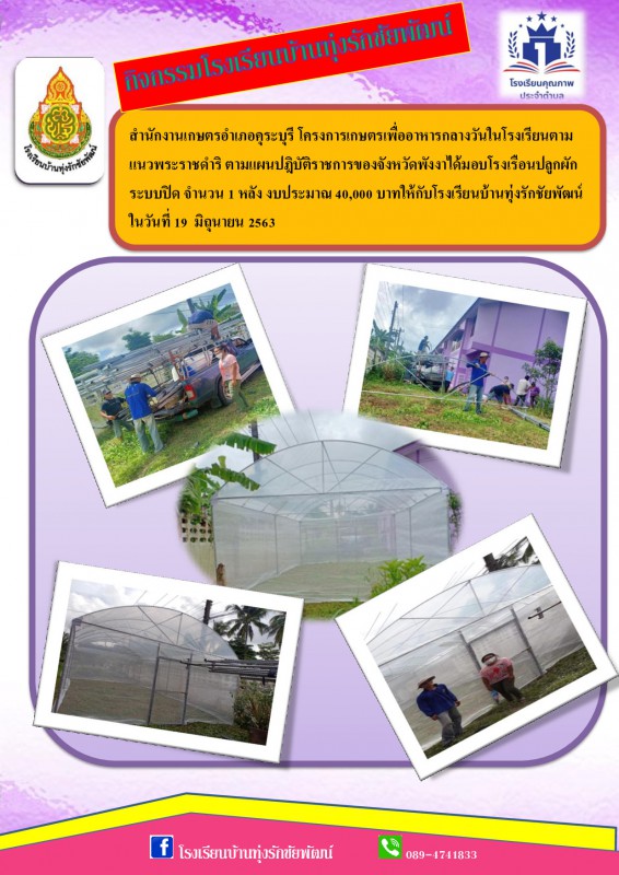 สำนักงานเกษตรอำเภอคุระบุรี โครงการเกษตรเพื่ออาหารกลางวันในโรงเรียนตามแนวพระราชดำริ ตามแผนปฎิบัติราชการของจังหวัดพังงาได้มอบโรงเรือนปลูกผักระบบปิด จำนวน 1 หลัง งบประมาณ 40,000 บาทให้กับโรงเรียนบ้านทุ่งรักชัยพัฒน์ ในวันที่ 19 มิถุนายน 2563