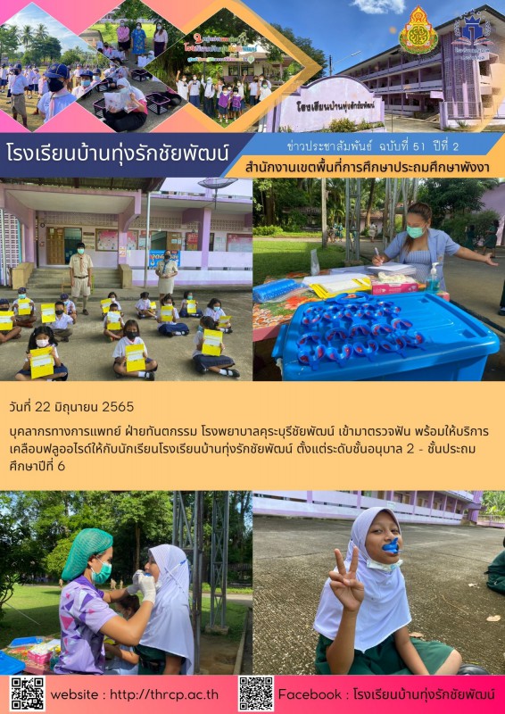 วันที่ 22 มิถุนายน 2565 บุคลากรทางการแพทย์ ฝ่ายทันตกรรม โรงพยาบาลคุระบุรีชัยพัฒน์ เข้ามาตรวจฟัน พร้อมให้บริการเคลือบฟลูออไรด์