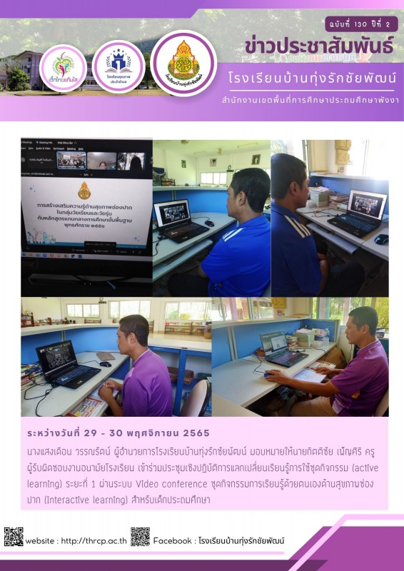 นางแสงเดือน วรรณรัตน์ ผู้อำนวยการโรงเรียนบ้านทุ่งรักชัยพัฒน์ มอบหมายให้นายกิตติชัย เพ็ญศิริ ครูผู้รับผิดชอบงานอนามัยโรงเรียน เข้าร่วมประชุมเชิงปฏิบัติการแลกเปลี่ยนเรียนรู้การใช้ชุดกิจกรรม (active learning) ระยะที่ 1 ผ่านระบบ Video conference ชุดกิจกรรมการเรียนรู้ด้วยตนเองด้านสุขภาพช่องปาก (Interactive learning) สำหรับเด็กประถมศึกษา |