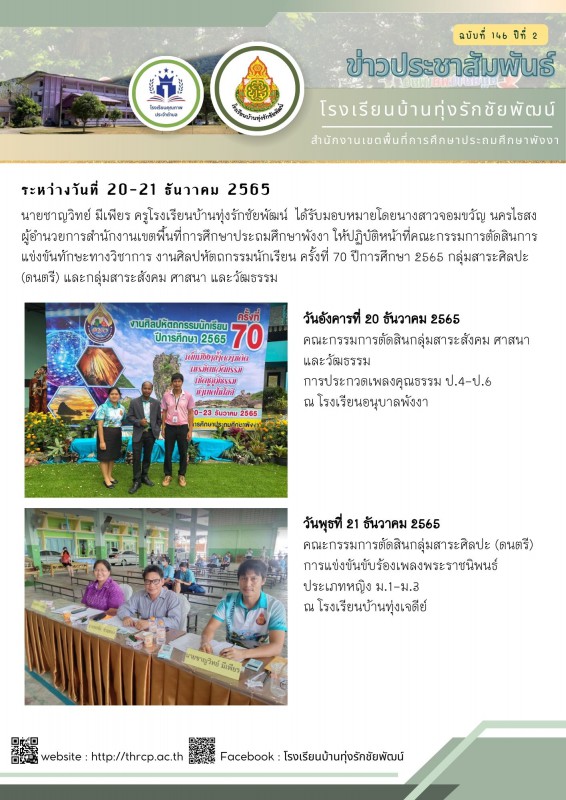 นายชาญวิทย์ มีเพียร ครูโรงเรียนบ้านทุ่งรักชัยพัฒน์ ได้รับมอบหมายโดยนางสาวจอมขวัญ นครไธสง ผู้อำนวยการสำนักงานเขตพื้นที่การศึกษาประถมศึกษาพังงา ให้ปฏิบัติหน้าที่คณะกรรมการตัดสินการแข่งขันทักษะทางวิชาการ งานศิลปหัตถกรรมนักเรียน ครั้งที่ 70 ปีการศึกษา 2565 กลุ่มสาระศิลปะ (ดนตรี) และกลุ่มสาระสังคม ศาสนา และวัฒธรรม