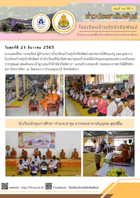นางแสงเดือน วรรณรัตน์ ผู้อำนวยการโรงเรียนบ้านทุ่งรักชัยพัฒน์ มอบหมายให้คณะครู และบุคลากรโรงเรียนบ้านทุ่งรักชัยพัฒน์ นำนักเรียนที่นับถือศาสนาพุทธเข้าร่วมพิธีเจริญพระพุทธมนต์ถวายเป็นพระราชกุศลแด่ สมเด็จพระเจ้าลูกเธอเจ้าฟ้าพัชรกิตติยาภา นเรนทิราเทพยวดี กรมหลวงราชสาริณีสิริพัชร มหาวัชรราชธิดา ณ วัดสวนวาง อำเภอคุระบุรี จังหวัดพังงา |