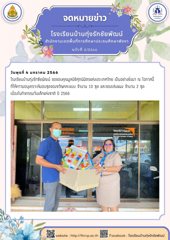โรงเรียนบ้านทุ่งรักชัยพัฒน์ ขอขอบคุณมูลนิธิศุภนิมิตรแห่งประเทศไทย เป็นอย่างยิ่งมา ณ โอกาสนี้ ที่ให้ความอนุเคราะห์มอบชุดของขวัญคละแบบ จำนวน 10 ชุด และของเล่นแผง จำนวน 2 ชุด เนื่องในกิจกรรมวันเด็กแห่งชาติ ปี 2566
