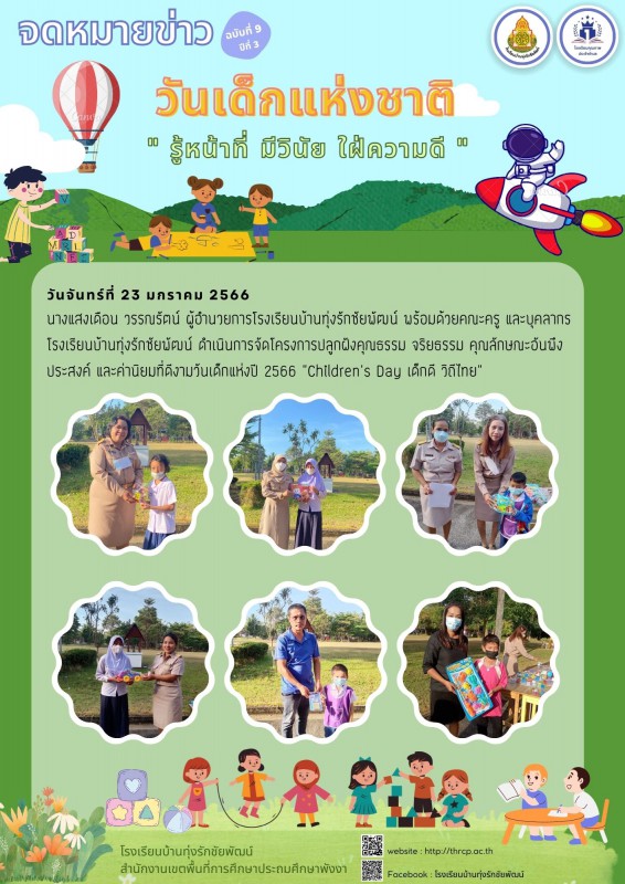 นางแสงเดือน วรรณรัตน์ ผู้อำนวยการโรงเรียนบ้านทุ่งรักชัยพัฒน์ พร้อมด้วยคณะครู และบุคลากรโรงเรียนบ้านทุ่งรักชัยพัฒน์ ดำเนินการจัดโครงการปลูกฝังคุณธรรม จริยธรรม คุณลักษณะอันพึงประสงค์ และค่านิยมที่ดีงามวันเด็กแห่งปี 2566 "Children's Day เด็กดี วิถีไทย" |