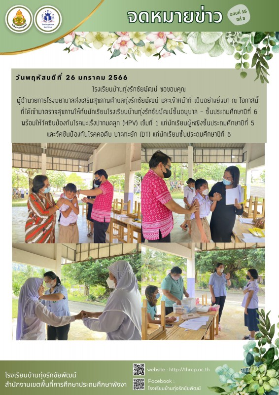 โรงเรียนบ้านทุ่งรักชัยพัฒน์ ขอขอบคุณ ผู้อำนวยการโรงพยาบาลส่งเสริมสุขภาพตำบลทุ่งรักชัยพัฒน์ และเจ้าหน้าที่ เป็นอย่างยิ่งมา ณ โอกาสนี้ ที่ได้เข้ามาตรวจสุขภาพให้กับนักเรียนโรงเรียนบ้านทุ่งรักชัยพัฒน์ชั้นอนุบาล - ชั้นประถมศึกษาปีที่ 6 พร้อมให้วัคซีนป้องกันโรคมะเร็งปากมดลูก (HPV) เข็มที่ 1 แก่นักเรียนผู้หญิงชั้นประถมศึกษาปีที่ 5 และวัคซีนป้ิองกันโรคคอตีบ บาดทะยัก (DT) แก่นักเรียนชั้นประถมศึกษาปีที่ 6