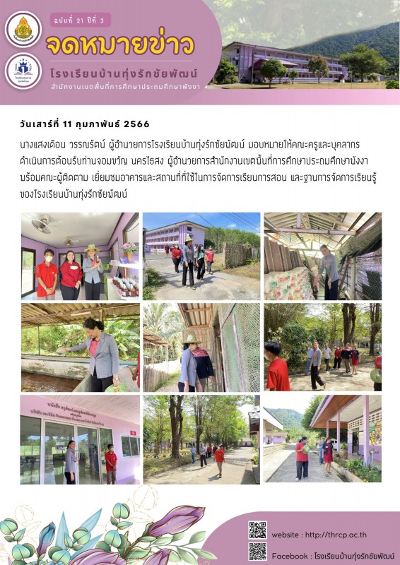 นางแสงเดือน วรรณรัตน์ ผู้อำนวยการโรงเรียนบ้านทุ่งรักชัยพัฒน์ มอบหมายให้คณะครูและบุคลากรดำเนินการต้อนรับท่านจอมขวัญ นครไธสง ผู้อำนวยการสำนักงานเขตพื้นที่การศึกษาประถมศึกษาพังงา พร้อมคณะผู้ติดตาม เยี่ยมชมอาคารและสถานที่ที่ใช้ในการจัดการเรียนการสอน และฐานการจัดการเรียนรู้ของโรงเรียนบ้านทุ่งรักชัยพัฒน์