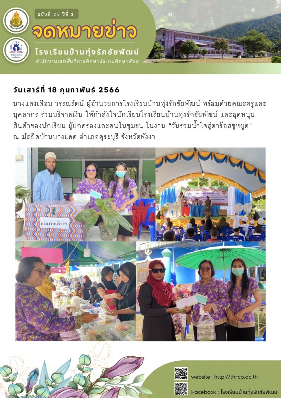 นางแสงเดือน วรรณรัตน์ ผู้อำนวยการโรงเรียนบ้านทุ่งรักชัยพัฒน์ พร้อมด้วยคณะครูและบุคลากร ร่วมบริจาคเงิน ให้กำลังใจนักเรียนโรงเรียนบ้านทุ่งรักชัยพัฒน์ และอุดหนุนสินค้าของนักเรียน ผู้ปกครองและคนในชุมชน ในงาน "วันรวมน้ำใจสู่ดาร๊อสซูหยูด" ณ มัสยิดบ้านบางแดด อำเภอคุระบุรี จังหวัดพังงา |