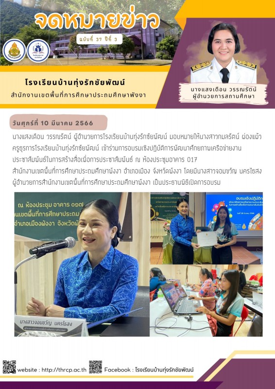 นางแสงเดือน วรรณรัตน์ ผูัอำนวยการโรงเรียนบ้านทุ่งรักชัยพัฒน์ มอบหมายให้นางสาวกมลรัตน์ ผ่องแผ้ว ครูธุรการโรงเรียนบ้านทุ่งรักชัยพัฒน์ เข้าร่วมการอบรมเชิงปฏิบัติการพัฒนาศักยภาพเครือข่ายงานประชาสัมพันธ์ในการสร้างสื่อเพื่อการประชาสัมพันธ์ ณ ห้องประชุมอาคาร 017 สำนักงานเขตพื้นที่การศึกษาประถมศึกษาพังงา อำเภอเมือง จังหวัดพังงา โดยมีนางสาวจอมขวัญ นครไธสง ผู้อำนวยการสำนักงานเขตพื้นที่การศึกษาประถมศึกษาพังงา เป็นประธานพิธีเปิดการอบรม