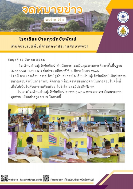 15 มีนาคม 2566 การประเมินคุณภาพการศึกษาขั้นพื้นฐาน (National Test : NT) ชั้นประถมศึกษาปีที่ 3 ปีการศึกษา 2565
