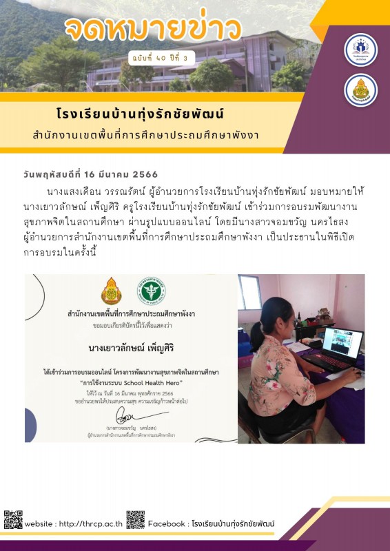 นางแสงเดือน วรรณรัตน์ ผู้อำนวยการโรงเรียนบ้านทุ่งรักชัยพัฒน์ มอบหมายให้นางเยาวลักษณ์ เพ็ญศิริ ครูโรงเรียนบ้านทุ่งรักชัยพัฒน์ เข้าร่วมการอบรมพัฒนางานสุขภาพจิตในสถานศึกษา ผ่านรูปแบบออนไลน์ โดยมีนางสาวจอมขวัญ นครไธสง ผู้อำนวยการสำนักงานเขตพื้นที่การศึกษาประถมศึกษาพังงา เป็นประธานในพิธีเปิดการอบรมในครั้งนี้ |