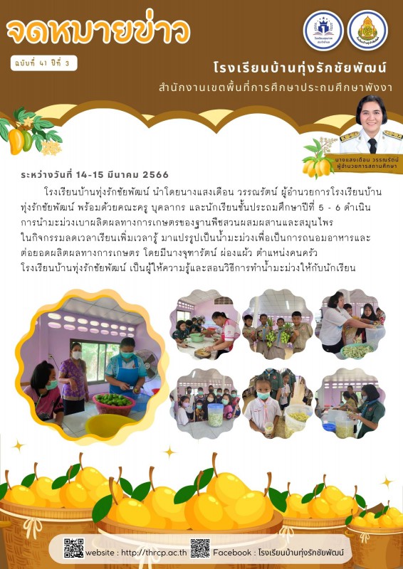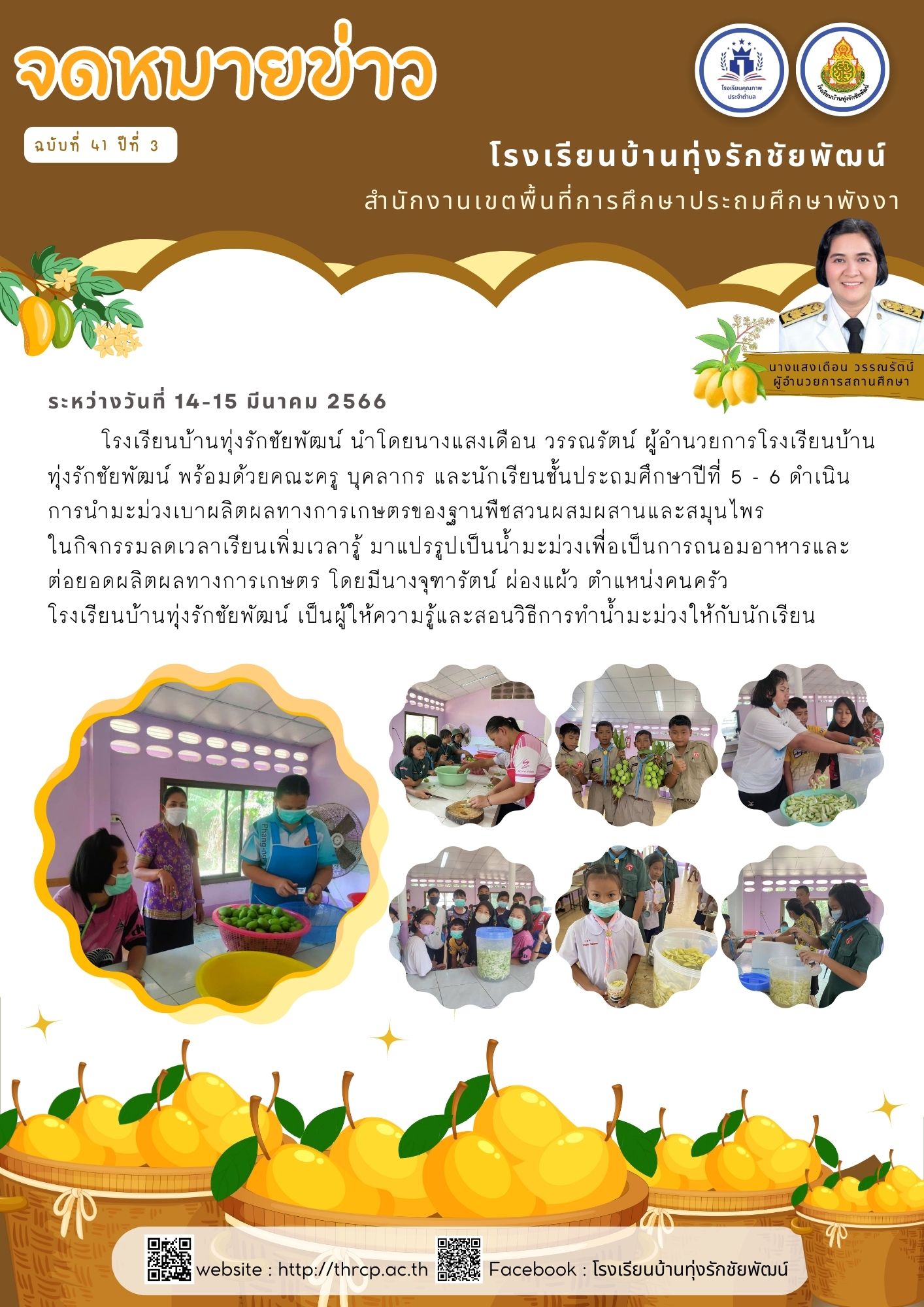 โรงเรียนบ้านทุ่งรักชัยพัฒน์ นำโดยนางแสงเดือน วรรณรัตน์ ผู้อำนวยการโรงเรียนบ้านทุ่งรักชัยพัฒน์ พร้อมด้วยคณะครู บุคลากร และนักเรียนชั้นประถมศึกษาปีที่ 5 - 6 ดำเนินการนำมะม่วงเบาผลิตผลทางการเกษตรของฐานพืชสวนผสมผสานและสมุนไพรในกิจกรรมลดเวลาเรียนเพิ่มเวลารู้ มาแปรรูปเป็นน้ำมะม่วงเพื่อเป็นการถนอมอาหารและต่อยอดผลิตผลทางการเกษตร โดยมีนางจุฑารัตน์ ผ่องแผ้ว ตำแหน่งคนครัวโรงเรียนบ้านทุ่งรักชัยพัฒน์ เป็นผู้ให้ความรู้และสอนวิธีการทำน้ำมะม่วงให้กับนักเรียน |