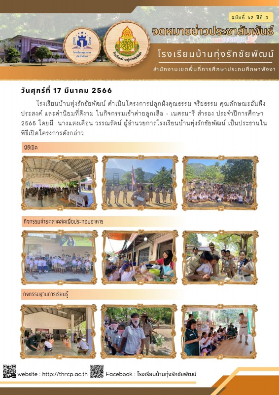 โรงเรียนบ้านทุ่งรักชัยพัฒน์ ดำเนินโครงการปลูกฝังคุณธรรม จริยธรรม คุณลักษณะอันพึงประสงค์ และค่านิยมที่ดีงาม ในกิจกรรมเข้าค่ายลูกเสือ - เนตรนารี สำรอง ประจำปีการศึกษา 2565 โดยมี นางแสงเดือน วรรณรัตน์ ผู้อำนวยการโรงเรียนบ้านทุ่งรักชัยพัฒน์ เป็นประธานในพิธีเปิดโครงการดังกล่าว |