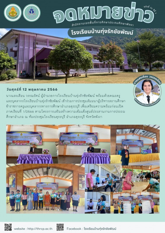 วันศุกร์ที่ 12 พฤษภาคม 2566 นางแสงเดือน วรรณรัตน์ ผู้อำนวยการโรงเรียนบ้านทุ่งรักชัยพัฒน์ พร้อมด้วยคณะครู และบุคลากรโรงเรียนบ้านทุ่งรักชัยพัฒน์ เข้าร่วมการประชุมสัมมนาผู้บริหารสถานศึกษา ข้าราชการครูและบุคลากรทางการศึกษาอำเภอคุระบุรี เพื่อเตรียมความพร้อมก่อนเปิดภาคเรียนที่ 1/2566 ตามโครงการเสริมสร้างความเข้มแข็งศูนย์ประสานงานการประถมศึกษาอำเภอ ณ ห้องประชุมโรงเรียนคุระบุรี อำเภอคุระบุรี จังหวัดพังงา |