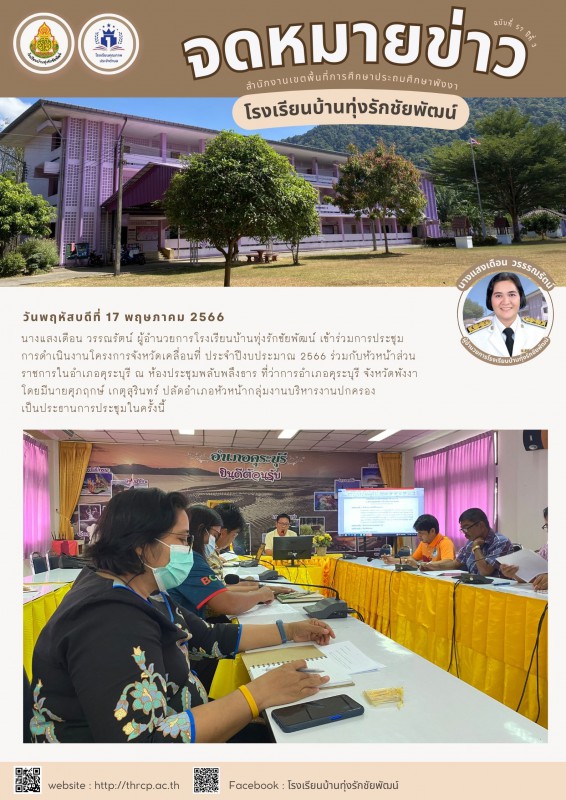 นางแสงเดือน วรรณรัตน์ ผู้อำนวยการโรงเรียนบ้านทุ่งรักชัยพัฒน์ เข้าร่วมการประชุมการดำเนินงานโครงการจังหวัดเคลื่อนที่ ประจำปีงบประมาณ 2566 ร่วมกับหัวหน้าส่วนราชการในอำเภอคุระบุรี ณ ห้องประชุมพลับพลึงธาร ที่ว่าการอำเภอคุระบุรี จังหวัดพังงา โดยมีนายศุภฤกษ์ เกตุสุรินทร์ ปลัดอำเภอหัวหน้ากลุ่มงานบริหารงานปกครอง เป็นประธานการประชุมในครั้งนี้
