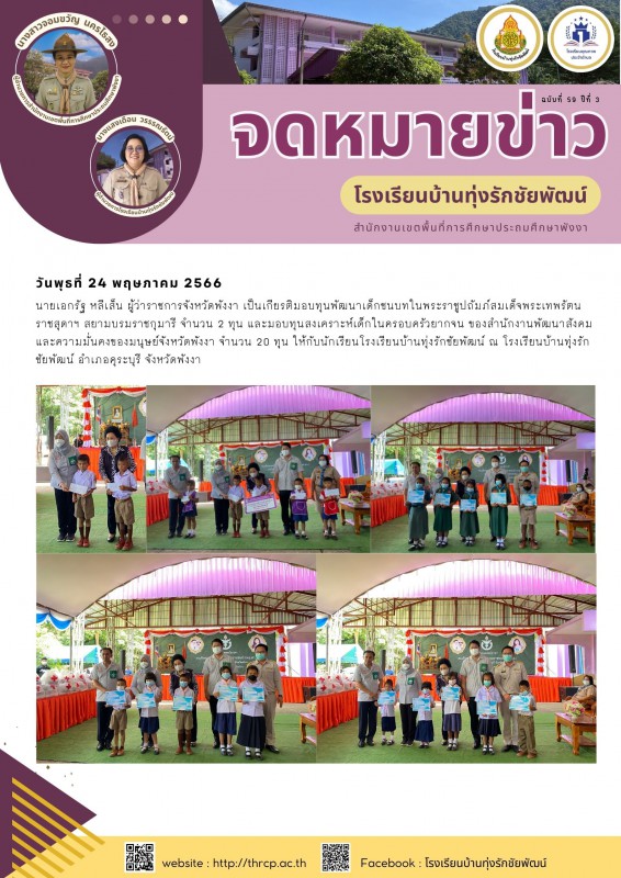 นายเอกรัฐ หลีเส็น ผู้ว่าราชการจังหวัดพังงา เป็นเกียรติมอบทุนพัฒนาเด็กชนบทในพระราชูปถัมภ์สมเด็จพระเทพรัตนราชสุดาฯ สยามบรมราชกุมารี จำนวน 2 ทุน และมอบทุนสงเคราะห์เด็กในครอบครัวยากจน ของสำนักงานพัฒนาสังคมและความมั่นคงของมนุษย์จังหวัดพังงา จำนวน 20 ทุน ให้กับนักเรียนโรงเรียนบ้านทุ่งรักชัยพัฒน์ ณ โรงเรียนบ้านทุ่งรักชัยพัฒน์ อำเภอคุระบุรี จังหวัดพังงา