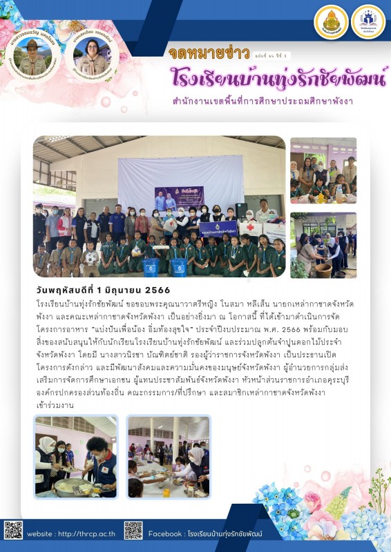 วันพฤหัสบดีที่ 1 มิถุนายน 2566 โรงเรียนบ้านทุ่งรักชัยพัฒน์ ขอขอบพระคุณนาวาตรีหญิง โนสมา หลีเส็น นายกเหล่ากาชาดจังหวัดพังงา และคณะเหล่ากาชาดจังหวัดพังงา เป็นอย่างยิ่งมา ณ โอกาสนี้ ที่ได้เข้ามาดำเนินการจัดโครงการอาหาร “แบ่งปันเพื่อน้อง อิ่มท้องสุขใจ” ประจำปีงบประมาณ พ.ศ. 2566 พร้อมกับมอบสิ่งของสนับสนุนให้กับนักเรียนโรงเรียนบ้านทุ่งรักชัยพัฒน์ และร่วมปลูกต้นจำปูนดอกไม้ประจำจังหวัดพังงา โดยมี นางสาวนิรชา บัณฑิตย์ชาติ รองผู้ว่าราชการจังหวัดพังงา เป็นประธานเปิดโครงการดังกล่าว และมีพัฒนาสังคมและความมั่นคงของมนุษย์จังหวัดพังงา ผู้อำนวยการกลุ่มส่งเสริมการจัดการศึกษาเอกชน ผู้แทนประชาสัมพันธ์จังหวัดพังงา หัวหน้าส่วนราชการอำเภอคุระบุรี องค์กรปกครองส่วนท้องถิ่น คณะกรรมการ/ที่ปรึกษา และสมาชิกเหล่ากาชาดจังหวัดพังงา เข้าร่วมงาน |