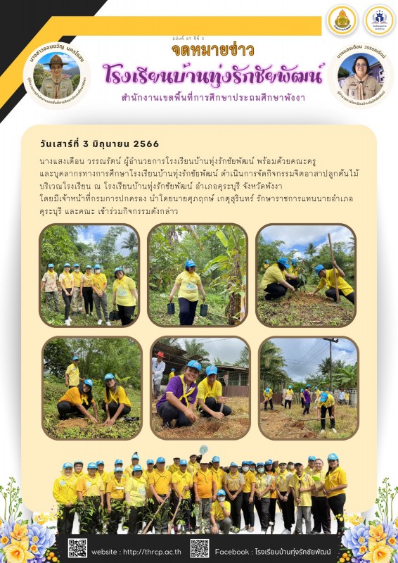 วันเสาร์ที่ 3 มิถุนายน 2566 นางแสงเดือน วรรณรัตน์ ผู้อำนวยการโรงเรียนบ้านทุ่งรักชัยพัฒน์ พร้อมด้วยคณะครู และบุคลากรทางการศึกษาโรงเรียนบ้านทุ่งรักชัยพัฒน์ ดำเนินการจัดกิจกรรมจิตอาสาปลูกต้นไม้ บริเวณโรงเรียน ณ โรงเรียนบ้านทุ่งรักชัยพัฒน์ อำเภอคุระบุรี จังหวัดพังงา โดยมีเจ้าหน้าที่กรมการปกครอง นำโดยนายศุภฤกษ์ เกตุสุรินทร์ รักษาราชการแทนนายอำเภอคุระบุรี และคณะ เข้าร่วมกิจกรรมดังกล่าว |