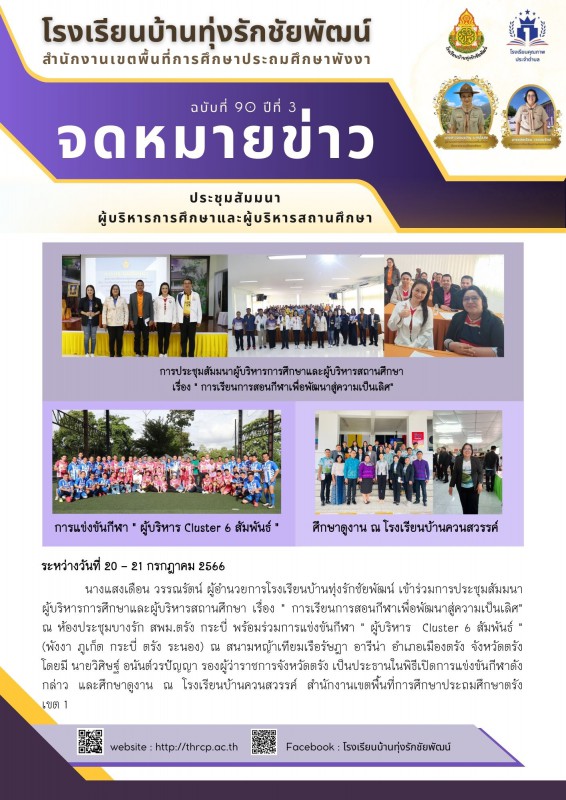 นางแสงเดือน วรรณรัตน์ ผู้อำนวยการโรงเรียนบ้านทุ่งรักชัยพัฒน์ เข้าร่วมการประชุมสัมมนา ผู้บริหารการศึกษาและผู้บริหารสถานศึกษา เรื่อง " การเรียนการสอนกีฬาเพื่อพัฒนาสู่ความเป็นเลิศ" ณ ห้องประชุมบางรัก สพม.ตรัง กระบี่ พร้อมร่วมการแข่งขันกีฬา " ผู้บริหาร Cluster 6 สัมพันธ์ " (พังงา ภูเก็ต กระบี่ ตรัง ระนอง) ณ สนามหญ้าเทียมเรือรัษฎา อารีน่า อำเภอเมืองตรัง จังหวัดตรัง โดยมี นายวิศิษฐ์ อนันต์วรปัญญา รองผู้ว่าราชการจังหวัดตรัง เป็นประธานในพิธีเปิดการแข่งขันกีฬาดังกล่าว และศึกษาดูงาน ณ โรงเรียนบ้านควนสวรรค์ สำนักงานเขตพื้นที่การศึกษาประถมศึกษาตรัง เขต 1