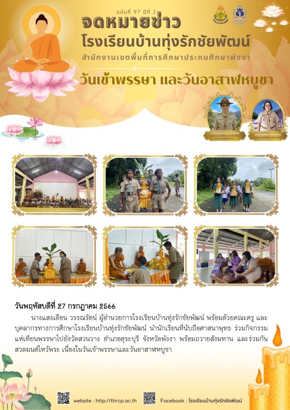 นางแสงเดือน วรรณรัตน์ ผู้อำนวยการโรงเรียนบ้านทุ่งรักชัยพัฒน์ พร้อมด้วยคณะครู และบุคลากรทางการศึกษาโรงเรียนบ้านทุ่งรักชัยพัฒน์ นำนักเรียนที่นับถือศาสนาพุทธ ร่วมกิจกรรมแห่เทียนพรรษาไปยังวัดสวนวาง อำเภอคุระบุรี จังหวัดพังงา พร้อมถวายสังฆทาน และร่วมกันสวดมนต์ไหว้พระ เนื่องในวันเข้าพรรษาและวันอาสาฬหบูชา |