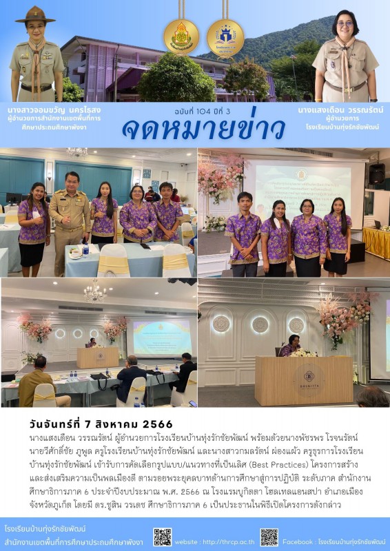 นางแสงเดือน วรรณรัตน์ ผู้อำนวยการโรงเรียนบ้านทุ่งรักชัยพัฒน์ พร้อมด้วยนางพัชรพร โรจนรัตน์ นายวีศักดิ์ชัย ภูพูล ครูโรงเรียนบ้านทุ่งรักชัยพัฒน์ และนางสาวกมลรัตน์ ผ่องแผ้ว ครูธุรการโรงเรียน บ้านทุ่งรักชัยพัฒน์ เข้ารับการคัดเลือกรูปแบบ/แนวทางที่เป็นเลิศ (Best Practices) โครงการสร้าง และส่งเสริมความเป็นพลเมืองดี ตามรอยพระยุคลบาทด้านการศึกษาสู่การปฏิบัติ ระดับภาค สำนักงานศึกษาธิการภาค 6 ประจำปีงบประมาณ พ.ศ. 2566 ณ โรงแรมบูกิตตา โฮลเทลแอนสปา อำเภอเมือง จังหวัดภูเก็ต โดยมี ดร.ชูสิน วรเดช ศึกษาธิการภาค 6 เป็นประธานในพิธีเปิดโครงการดังกล่าว |