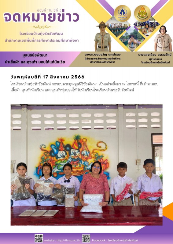 17 สิงหาคม 2566 มูลนิธิชัยพัฒนา มอบเสื้อผ้า ถุงเท้านักเรียน และถุงเท้าฟุตบอลให้กับนักเรียน