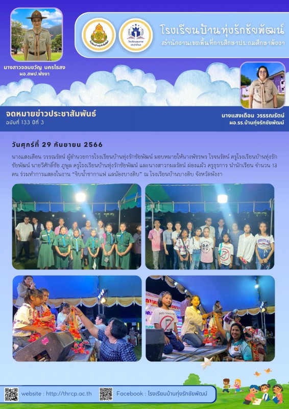 นางแสงเดือน วรรณรัตน์ ผู้อำนวยการโรงเรียนบ้านทุ่งรักชัยพัฒน์ มอบหมายให้นางพัชรพร โรจนรัตน์ ครูโรงเรียนบ้านทุ่งรักชัยพัฒน์ นายวีศักดิ์ชัย ภูพูล ครูโรงเรียนบ้านทุ่งรักชัยพัฒน์ และนางสาวกมลรัตน์ ผ่องแผ้ว ครูธุรการ นำนักเรียน จำนวน 13 คน ร่วมทำการแสดงในงาน “จิบน้ำชากาแฟ แลน้องบางติบ” ณ โรงเรียนบ้านบางติบ จังหวัดพังงา |