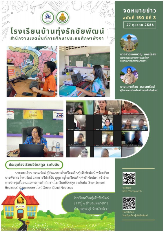 นางแสงเดือน วรรณรัตน์ ผู้อำนวยการโรงเรียนบ้านทุ่งรักชัยพัฒน์ พร้อมด้วยนางพัชรพร โรจนรัตน์ และนายวีศักดิ์ชัย ภูพูล ครูโรงเรียนบ้านทุ่งรักชัยพัฒน์ เข้าร่วมการประชุมชี้แจงแนวทางการดำเนินงานโรงเรียนอีโคสคูล ระดับต้น (Eco-School Beginner) ผ่านระบบออนไลน์ Zoom Cloud Meetings ประชุมโรงเรียนอีโคสคูล ระดับต้น |