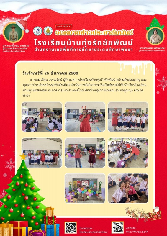 นางแสงเดือน วรรณรัตน์ ผู้อำนวยการโรงเรียนบ้านทุ่งรักชัยพัฒน์ พร้อมด้วยคณะครู และบุคลากรโรงเรียนบ้านทุ่งรักชัยพัฒน์ ดำเนินการจัดกิจกรรมวันคริสต์มาสให้กับนักเรียนโรงเรียนบ้านทุ่งรักชัยพัฒน์ ณ อาคารอเนกประสงค์โรงเรียนบ้านทุ่งรักชัยพัฒน์ อำเภอคุระบุรี จังหวัดพังงา