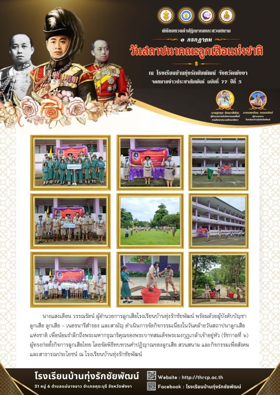 นางแสงเดือน วรรณรัตน์ ผู้อำนวยการลูกเสือโรงเรียนบ้านทุ่งรักชัยพัฒน์ พร้อมด้วยผู้บังคับบัญชาลูกเสือ ลูกเสือ - เนตรนารีสำรอง และสามัญ ดำเนินการจัดกิจกรรมเนื่องในวันคล้ายวันสถาปนาลูกเสือแห่งชาติ เพื่อน้อมรำลึกถึงพระมหากรุณาธิคุณของพระบาทสมเด็จพระมงกุฏเกล้าเจ้าอยู่หัว (รัชกาลที่ ๖) ผู้ทรงก่อตั้งกิจการลูกเสือไทย โดยจัดพิธีทบทวนคำปฏิญาณของลูกเสือ สวนสนาม และกิจกรรมเพื่อสังคมและสาธารณประโยชน์ ณ โรงเรียนบ้านทุ่งรักชัยพัฒน์ |