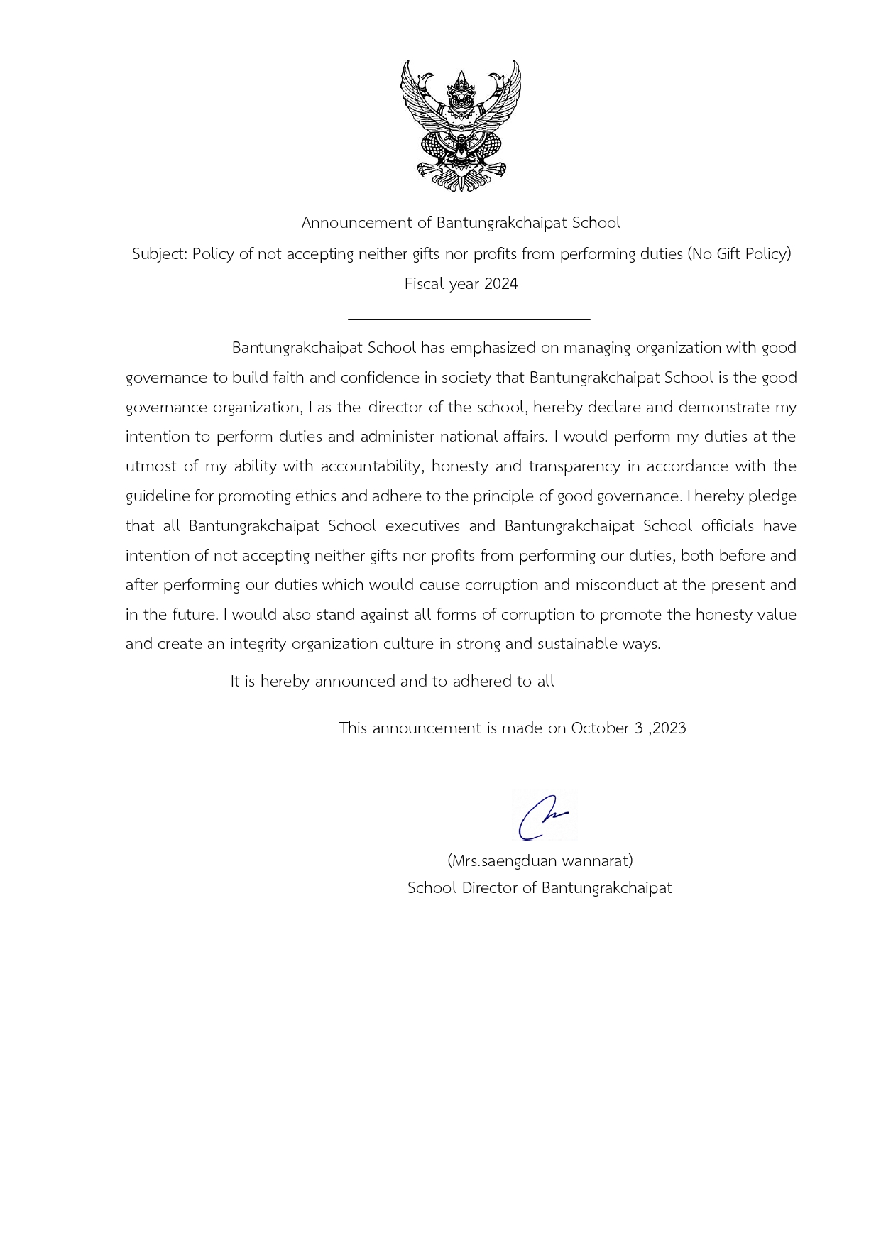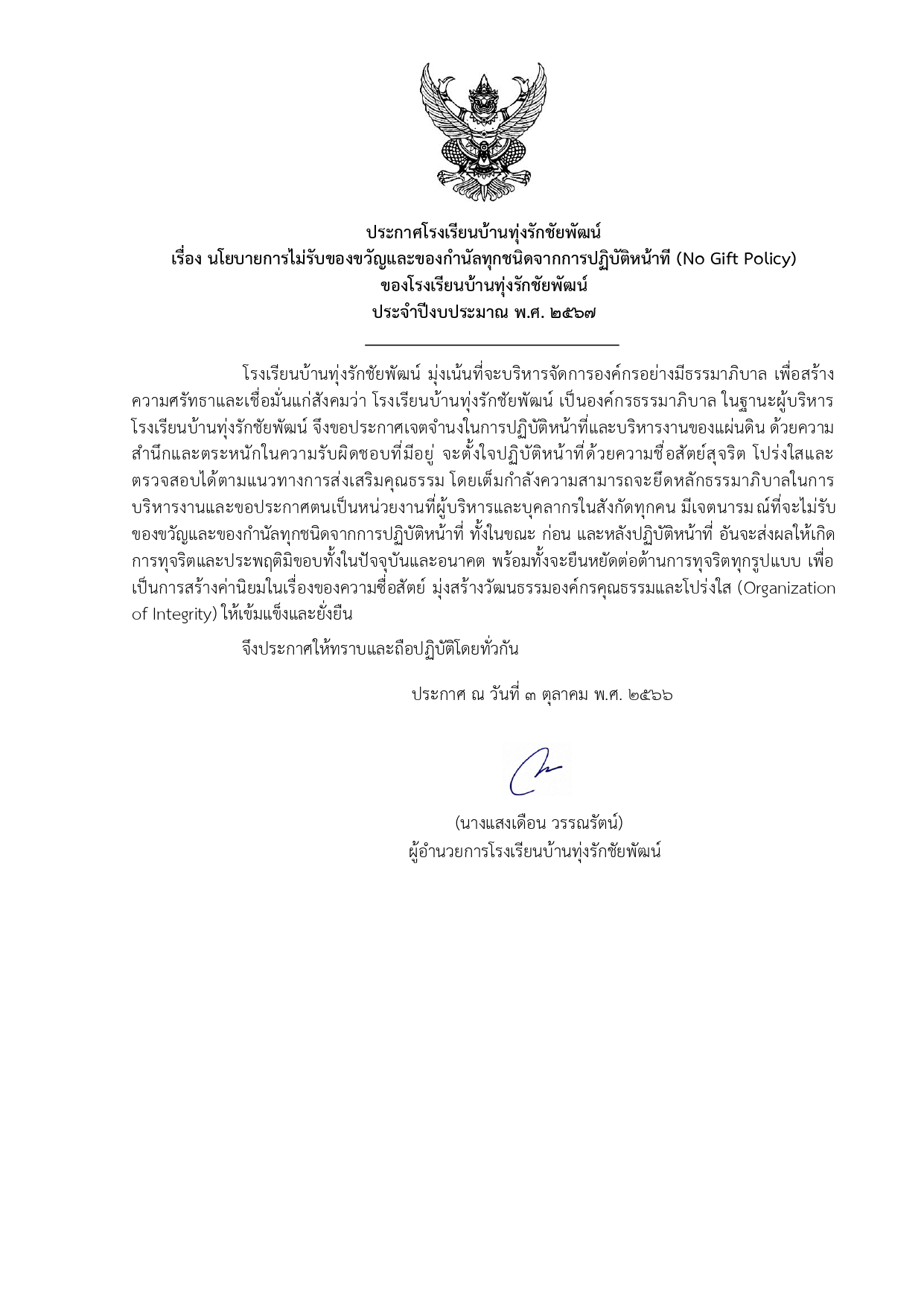 ประกาศเจตนารมณ์นโยบาย No Gift Policy จากการปฏิบัติหน้าที่